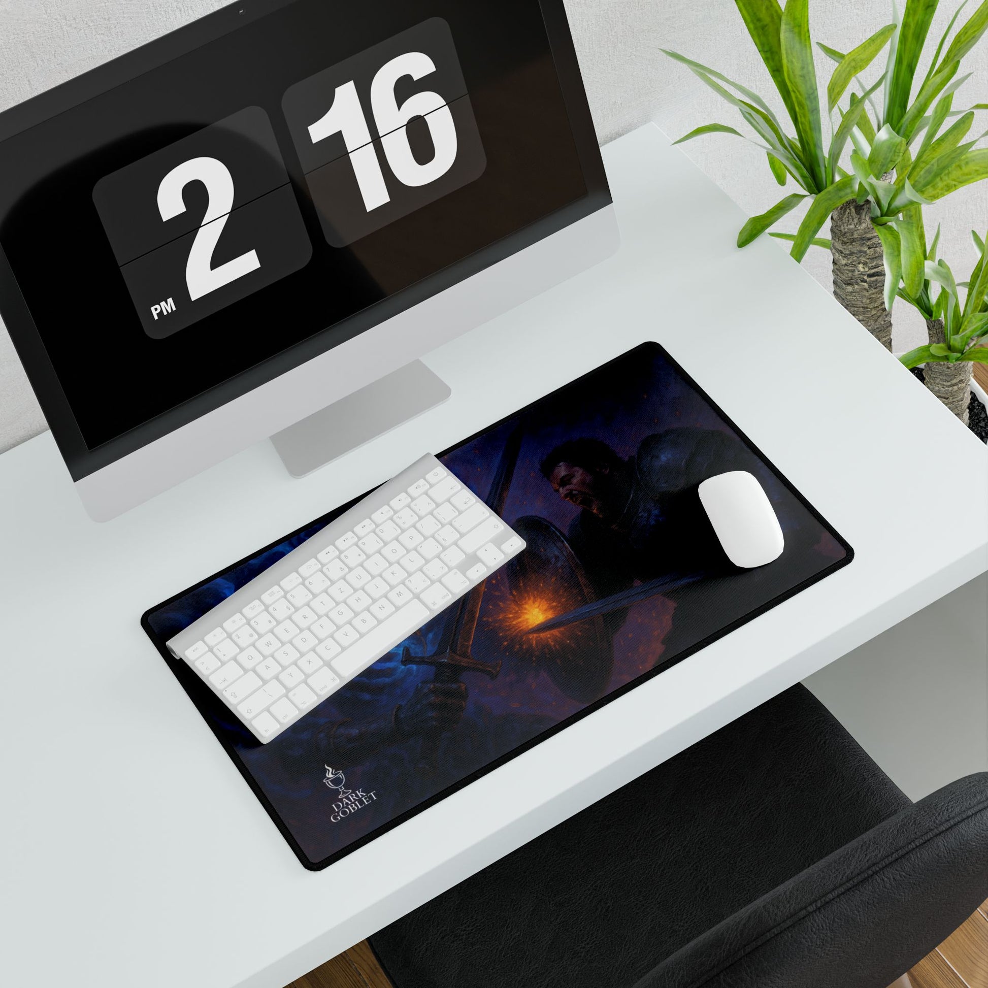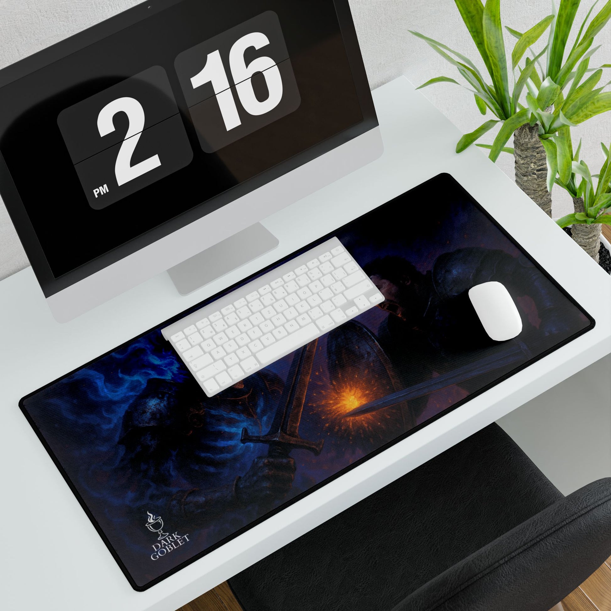 A wide, battle-ready desk mat that brings tabletop fantasy straight to your workspace. Deep, painterly artwork shows a stalwart defender meeting a spectral foe beneath a storm of blue magic — a scene that fuels focus during long sessions of gaming or creative work. The plush polyester surface keeps colors rich and details sharp, while the natural rubber base locks the mat in place so your keyboard and mouse never slip mid-encounter. Sized for expansive setups, this mat doubles as a protective layer for your desk and a statement piece that speaks to nights spent strategizing campaigns or streaming epic raids.